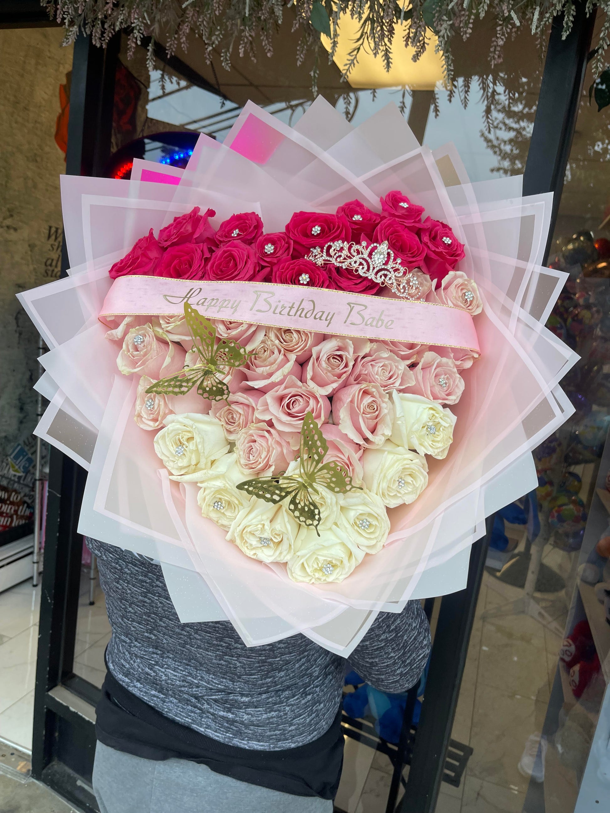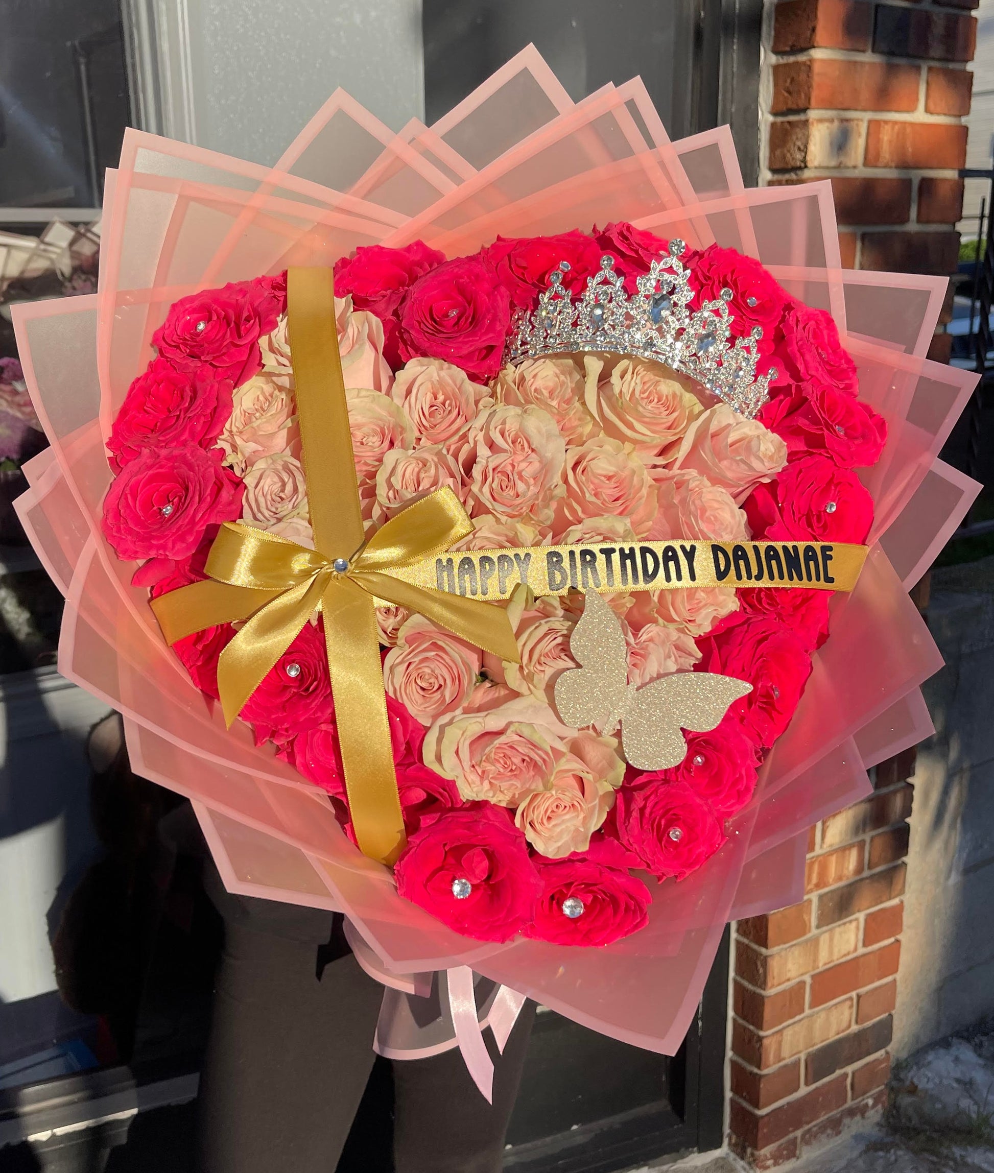 This ramo buchon comes with 50 fresh pink roses along with the crown, sash and butterflies.