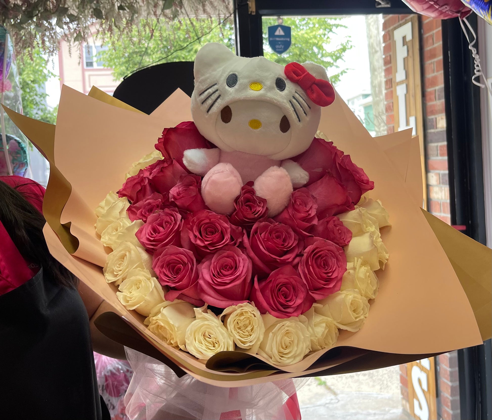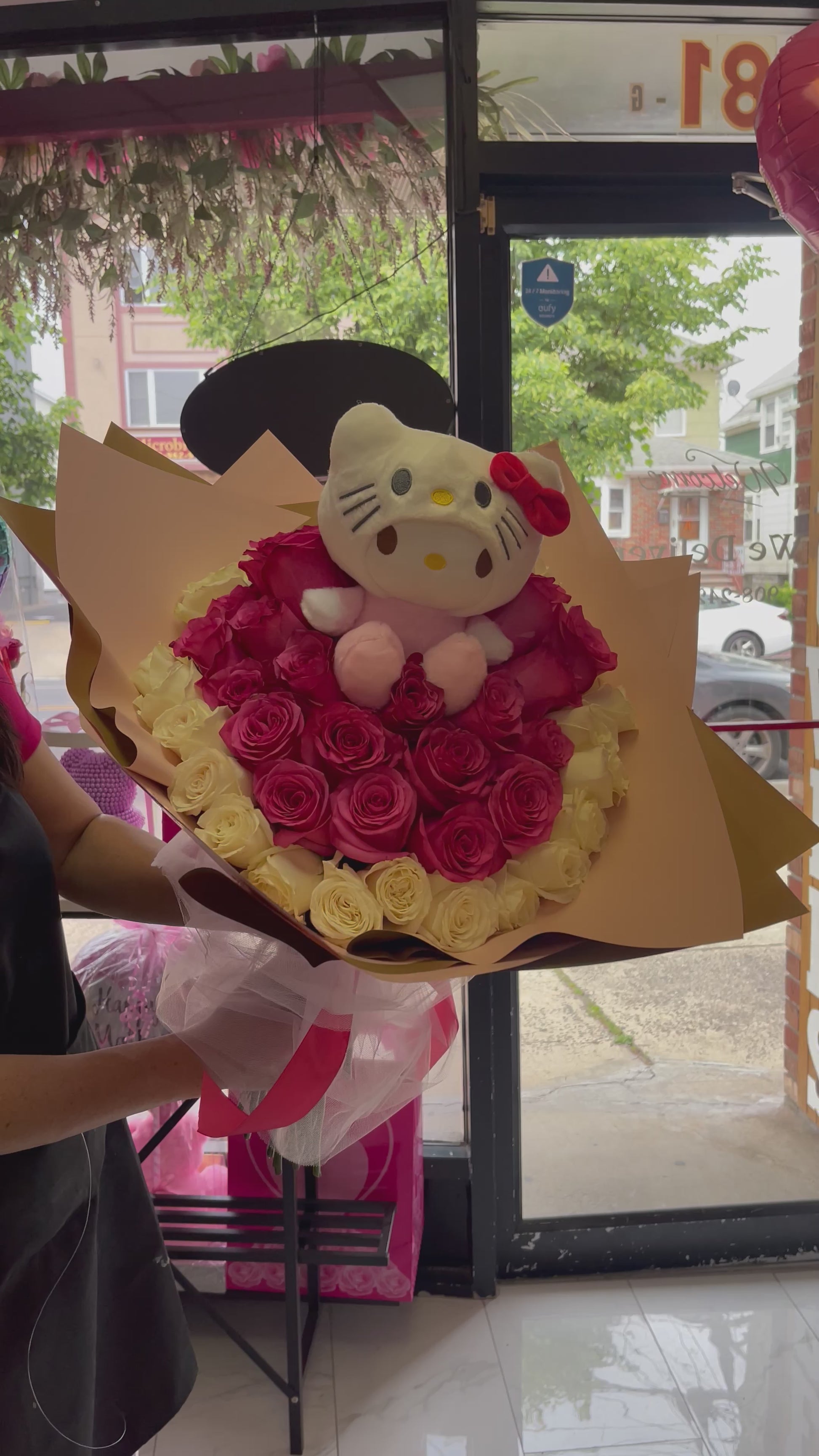 Hello Kitty themed ramo with white and pink roses, also comes with a hello kitty plush.