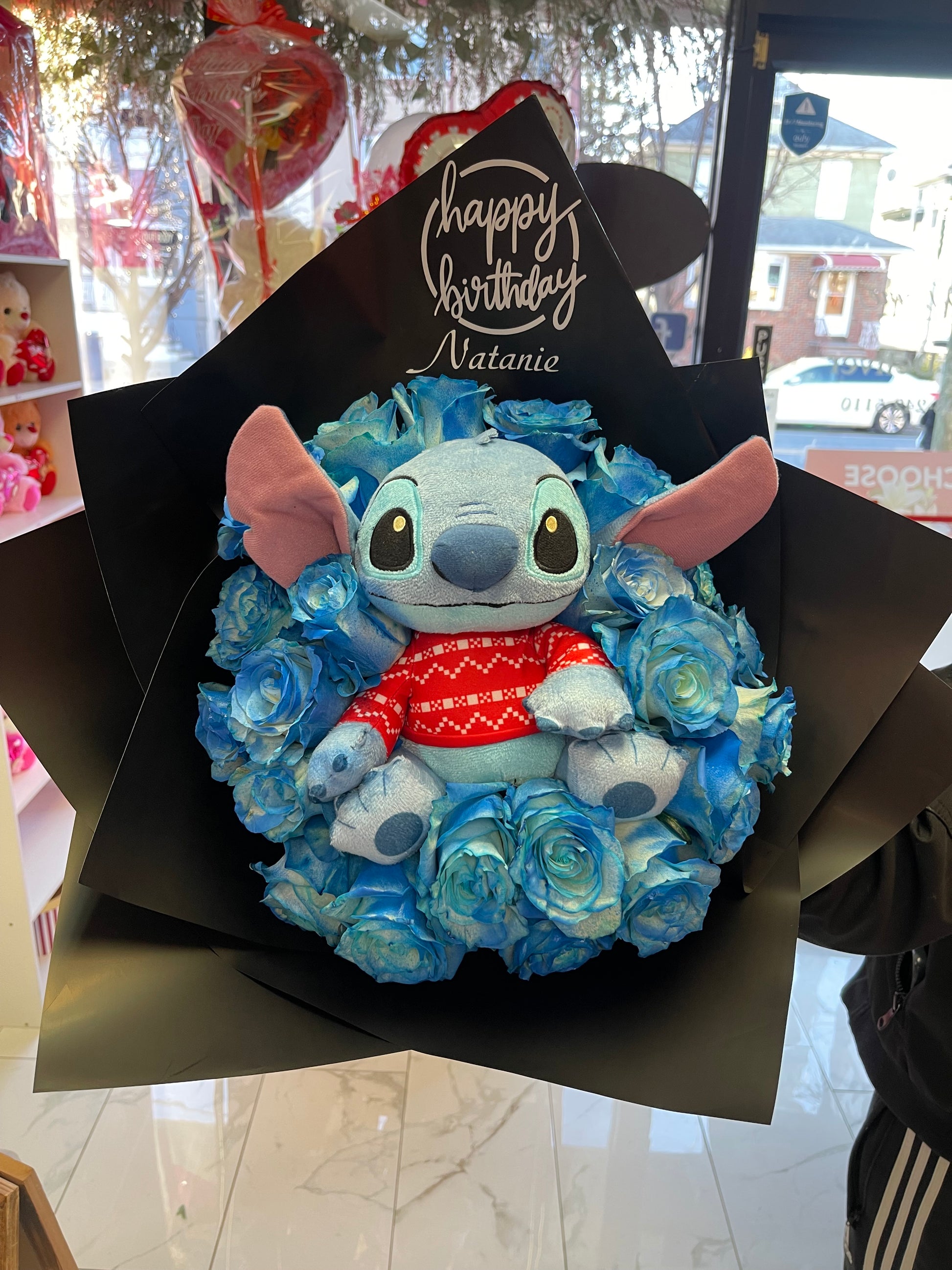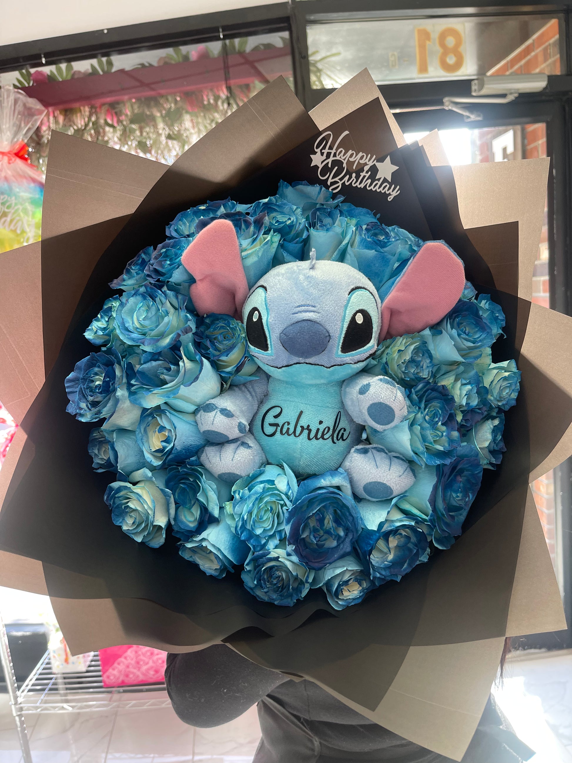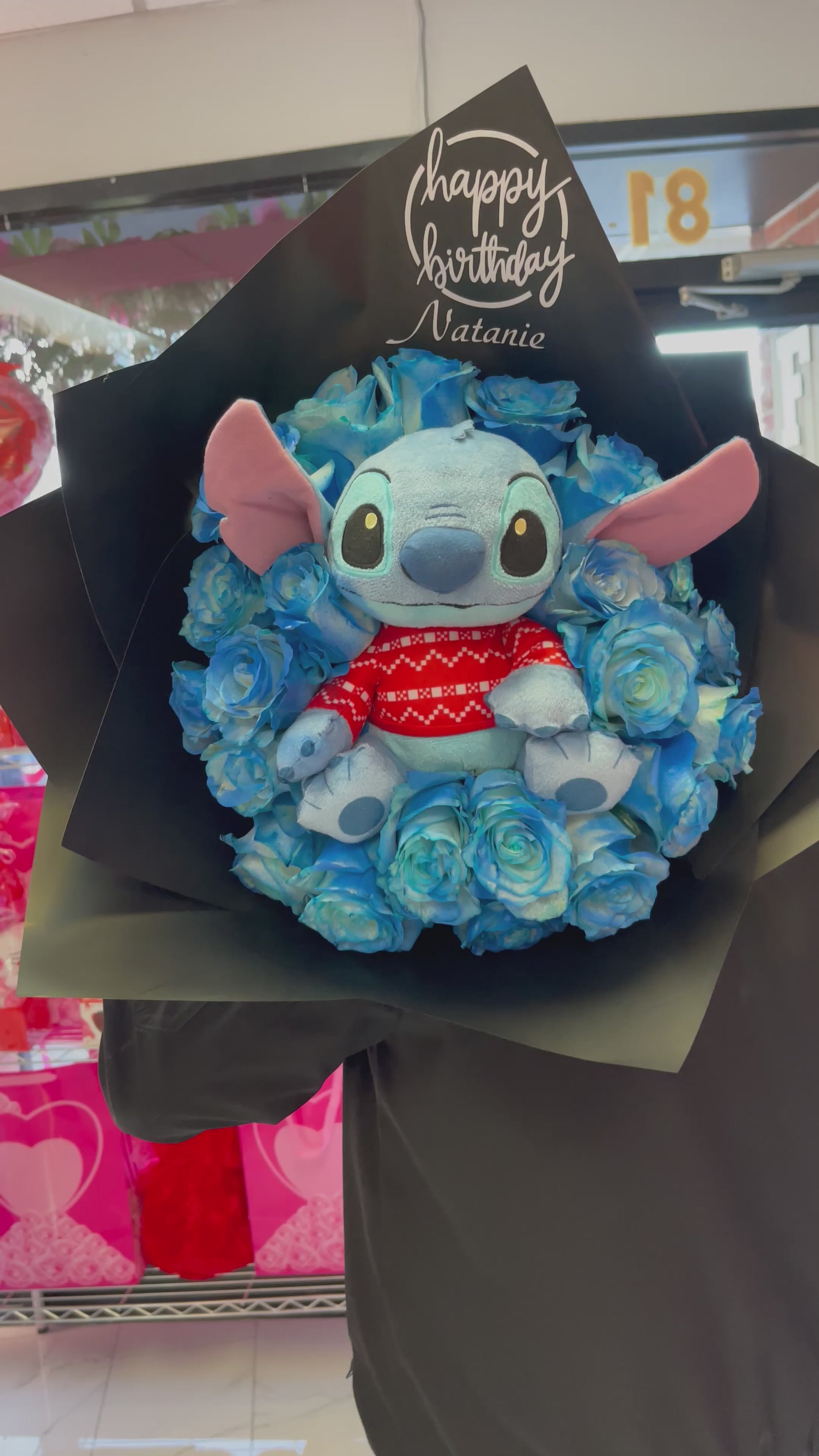 This bouquet comes with 50, 75, or 100 blue roses along with the Stitch plushie. (The message will be printed as seen in picture).