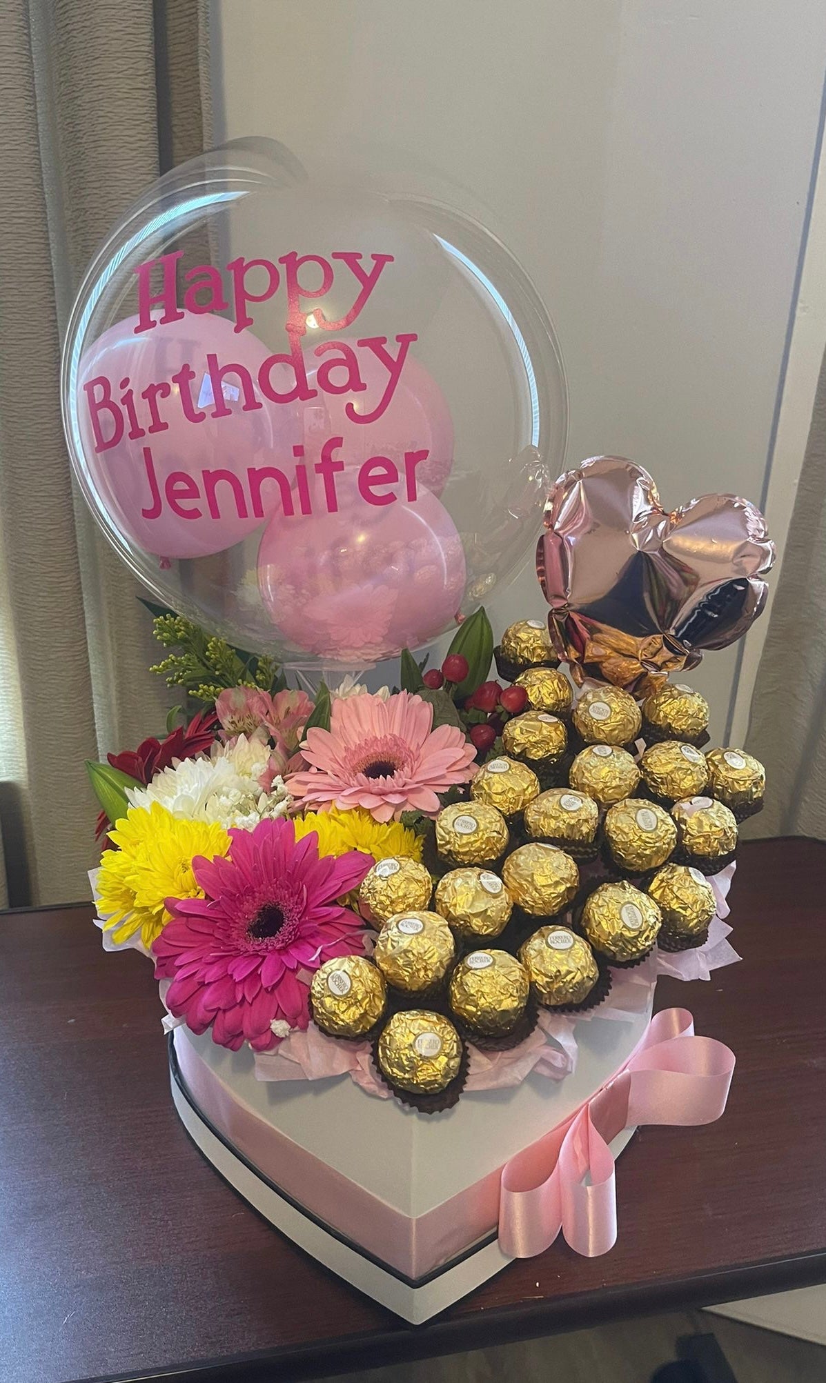 This beautiful heart shaped box comes with 20 chocolates, a personalized balloon and flowers of your choice.