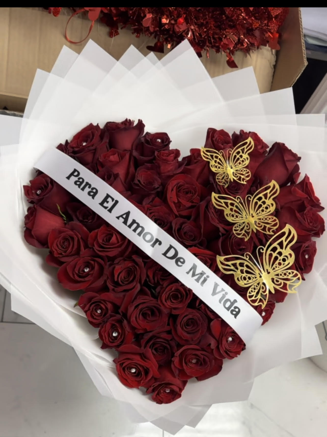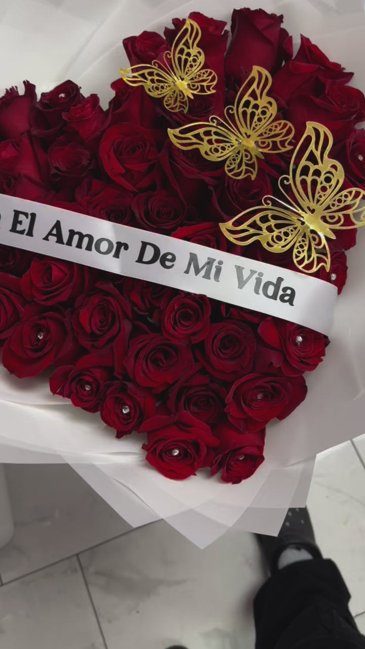 This bouquet comes with 50 red Ecuadorian long stem roses. Sash and butterflies included.