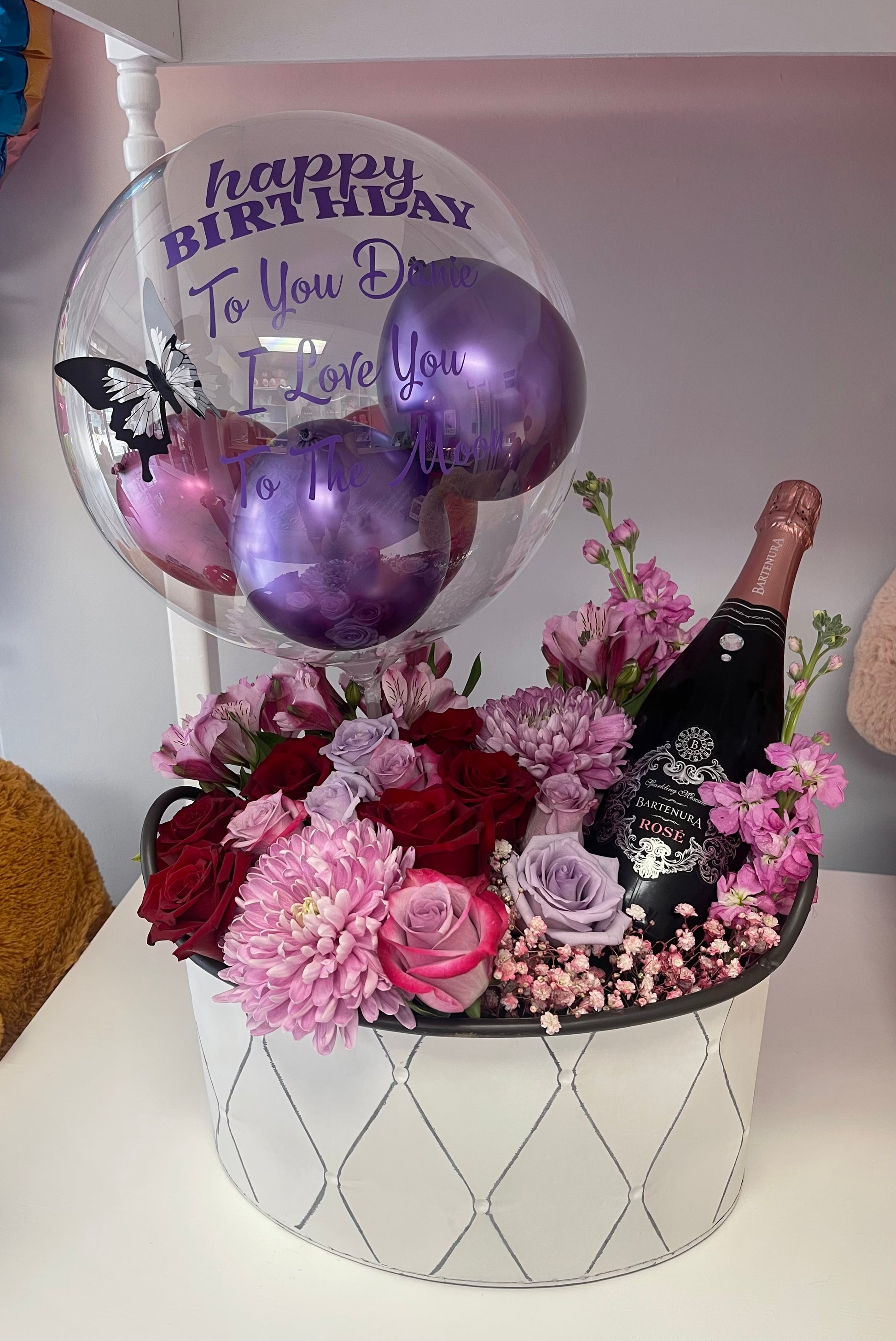 This basket comes with a mix of red, pink and a splash of purple roses. It also comes with a personalized balloon message. (wine is not included, must be provided by customer).